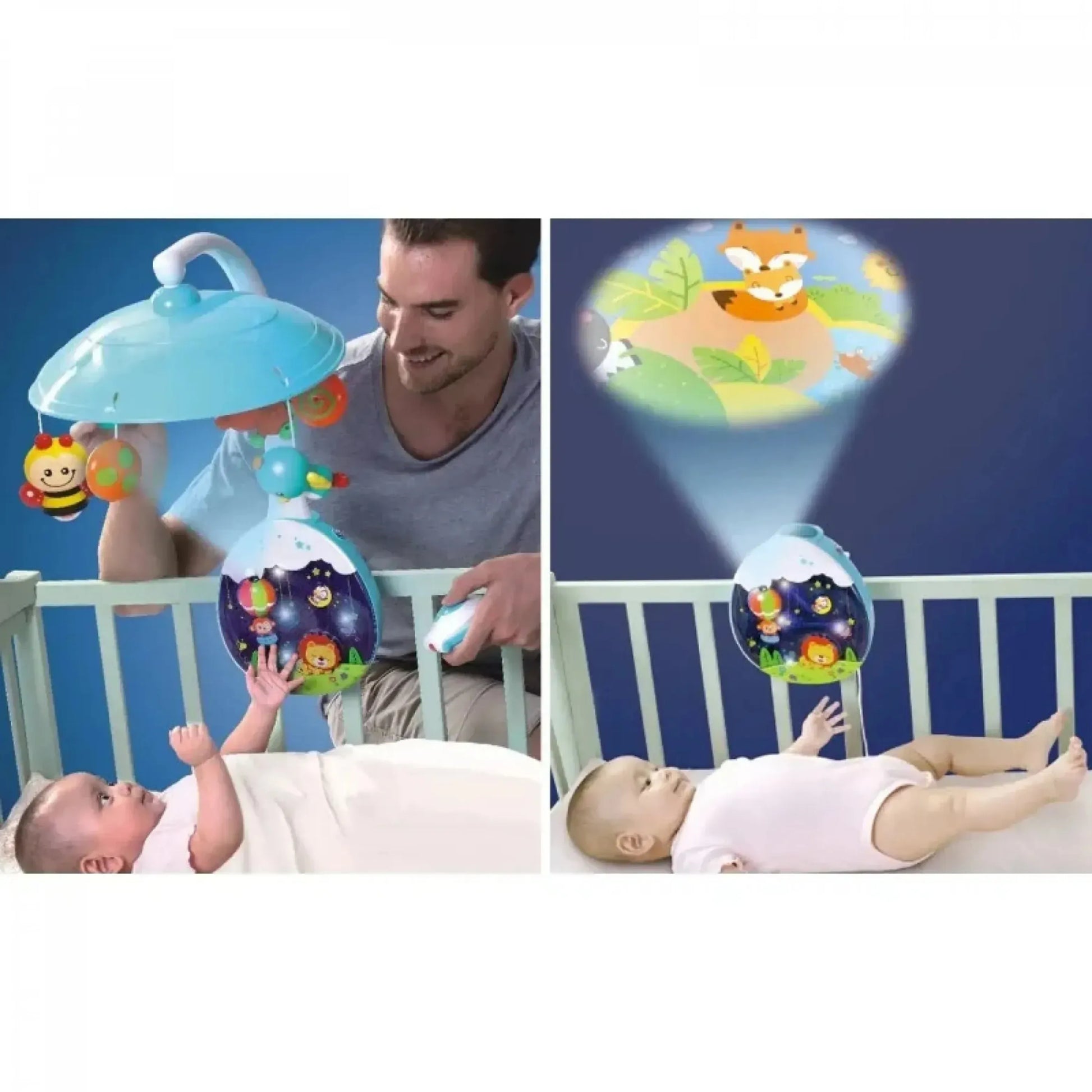 - Inside the Box: 1 Musical Mobile Arm, 1 Projector Unit, Hanging Toys, 1 Remote